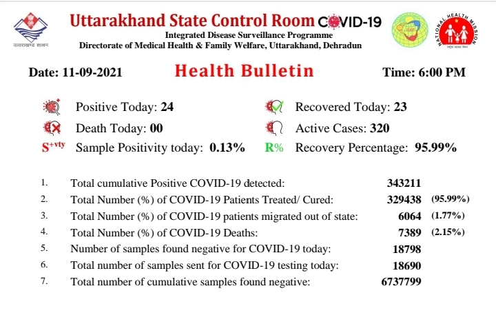 उत्तराखंड स्टेट कंट्रोल रूम कोविड-19 के आज हेल्थ बुलेटिन में आज अल्मोड़ा ,चमोली, हरिद्वार ,नैनीताल, पौड़ी गढ़वाल,रुद्रप्रयाग टिहरी गढ़वाल,उधम सिंह नगर इन जनपदों में आज एक भी कोरोना से पीड़ित व्यक्ति नहीं मिला जबकि आज बागेश्वर में एक,चंपावत में छह,देहरादून में पांच,पिथौरागढ़ में 4,तथा उत्तरकाशी में 8 लोगों में इस संक्रमण के लक्षण मिले हैं इस तरह आज 24 नए संक्रमित मरीज मिलने के साथ राज्य में आंकड़ा बढ़कर के 343211 हो गया है राहत भरी खबर यह है कि आज कहीं से किसी मरीज की मौत की खबर नहीं है।।