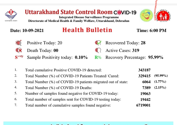 उत्तराखंड स्टेट कंट्रोल रूम कोविड-19 के 6:00 बजे के स्वास्थ्य बुलेटिन के अनुसार आज उधम सिंह नगर, टिहरी गढ़वाल, रुद्रप्रयाग, पिथौरागढ़, पौड़ी गढ़वाल, जनपद ऐसे हैं जहां आज एक भी इस संक्रमण से पीड़ित व्यक्ति नहीं मिला जबकि अल्मोड़ा में तीन, बागेश्वर में दो, चमोली में चार, चंपावत में तीन, देहरादून में एक, हरिद्वार में चार, नैनीताल में दो, तथा उत्तरकाशी में एक, व्यक्ति इस संक्रमण से पीड़ित हुआ इस तरह आज संक्रमित मरीज मिलने के साथ राज्य में आंकड़ा बढ़कर के 343187 हो गया है।