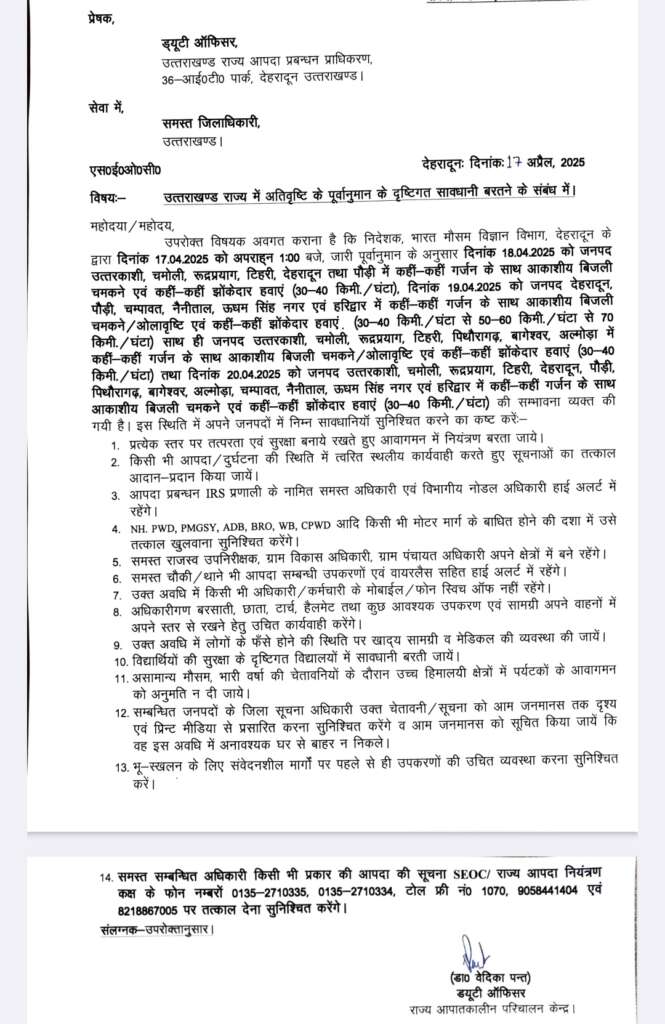 उत्तराखण्ड राज्य आपदा प्रबन्धन प्राधिकरण, 36-आई०टी० पार्क, देहरादून उत्तराखण्ड ने समस्त जिलाधिकारी, को राज्य में ओलावृष्टि अतिवृष्टि को लेकर सतर्कता बरतने के निर्देश जारी किए हैं।