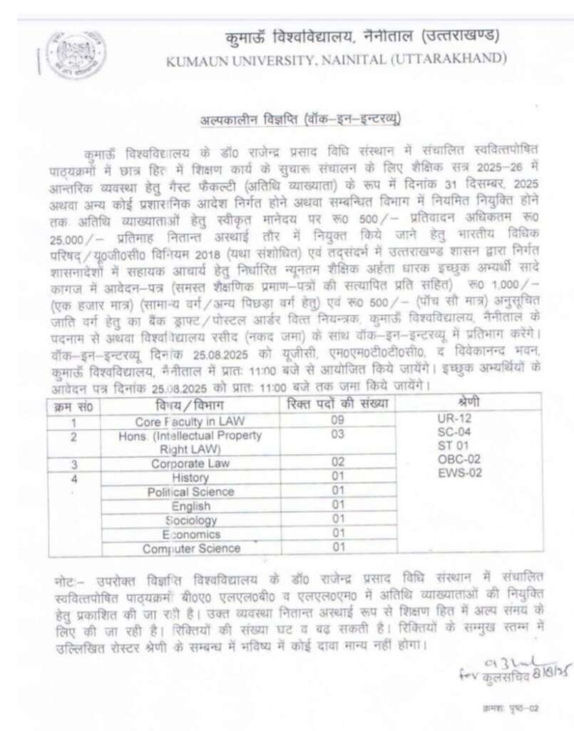 प्रशासनिक आदेश निर्गत होने अथवा सम्बन्धित विभाग में नियमित नियुक्ति होने तक अतिथि व्याख्याताओं हेतु स्वीकृत मानेदय पर रू० 500/-प्रतिवादन अधिकतम रू० 25,000/- प्रतिमाह नितान्त अस्थाई तौर में नियुक्त किये जाने हेतु भारतीय विधिक परिषद् / यू०जी०सी० विनियम 2018 (यथा संशोधित) एवं तदसंदर्भ में उत्तराखण्ड शासन द्वारा निर्गत शासनादेशों में सहायक आचार्य हेतु निर्धारित न्यूनतम शैक्षिक अर्हता धारक इच्छुक अभ्यर्थी सादे कागज में आवेदन-पत्र (समस्त शैक्षणिक प्रमाण-पत्रों की सत्यापित प्रति सहित) रू0 1,000/-(एक हजार मात्र) (सामान्य वर्ग/अन्य पिछडा वर्ग हेतु) एवं रू0 500/- (पाँच सौ मात्र) अनुसूचित जाति वर्ग हेतु का बैंक ड्राफ्ट / पोस्टल आर्डर वित्त नियन्त्रक, कुमाऊँ विश्वविद्यालय, नैनीताल के पदनाम से अथवा विश्वविद्यालय रसीद (नकद जमा) के सांथ वॉक-इन-इन्टरव्यू में प्रतिभाग करेंगे। वॉक-इन-इन्टरव्यू दिनांक 25.08.2025 को यूजीसी, एम०एम०टी०टी०सी०, द विवेकानन्द भवन, कुमाऊँ विश्वविद्यालय, नैनीताल में प्रातः 11:00 बजे से आयोजित किये जायेंगे। इच्छुक अभ्यर्थियों के आवेदन पत्र दिनांक 25.08.2025 को प्रातः 11:00 बजे तक जमा किये जायेंगे।