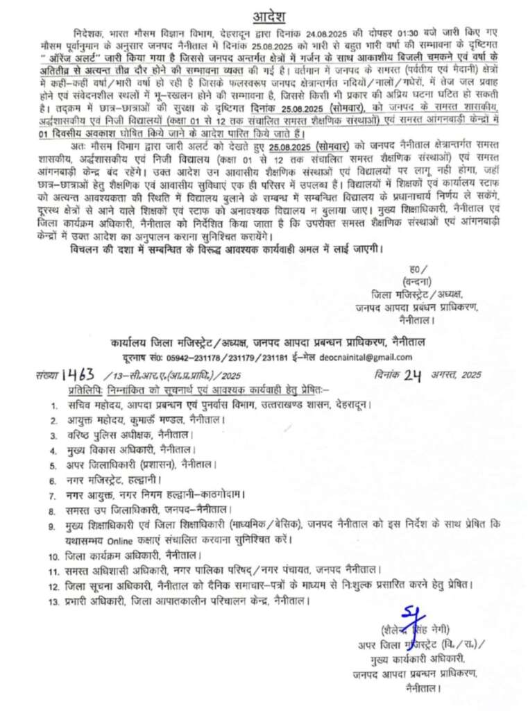 उत्तराखंड में मौसम विभाग द्वारा जारी पूर्वानुमान के मुताबिक कल यानी 25 अगस्त को भारी बारिश की चेतावनी जारी की गई है। नैनीताल जिले में भी तेज बारिश के दौर का अंदेशा है। जिसके मद्देनजर जिलाधिकारी नैनीताल वंदना सिंह ने स्कूली बच्चों की सुरक्षा के दृष्टिगत 25 अगस्त (सोमवार) को जनपद के सभी स्कूलों में कक्षा 1 से 12 तक एवं आंगनबाड़ी केंद्रों में अवकाश के आदेश जारी कर दिए हैं।