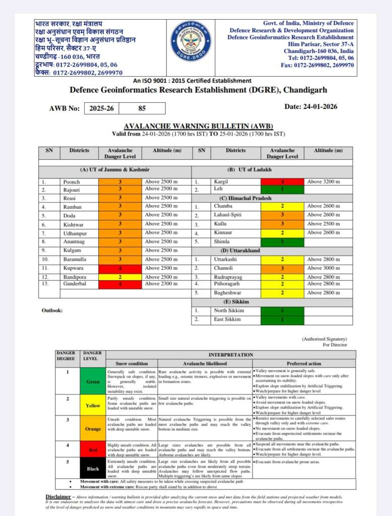भारत सरकार के रक्षा मंत्रालय के अंतर्गत रक्षा अनुसंधान एवं विकास संगठन (डीआरडीओ) की इकाई डिफेंस जियोइन्फॉर्मेटिक्स रिसर्च एस्टैब्लिशमेंट (DGRE), चंडीगढ़ द्वारा 24 जनवरी 2026 शाम 5 बजे से 25 जनवरी 2026 शाम 5 बजे तक के लिए हिमस्खलन चेतावनी बुलेटिन (AWB) जारी किया गया है।