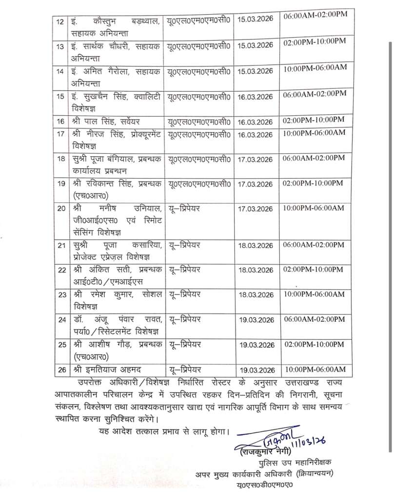 निर्धारित रोस्टर के अनुसार तैनात अधिकारी एवं विशेषज्ञ उत्तराखण्ड राज्य आपातकालीन परिचालन केन्द्र में नियमित रूप से उपस्थित रहेंगे। वे प्रतिदिन खाद्य एवं रसद की स्थिति की समीक्षा करेंगे, आवश्यक सूचनाओं का संकलन एवं विश्लेषण करेंगे तथा आवश्यकता पड़ने पर खाद्य एवं नागरिक आपूर्ति विभाग के साथ समन्वय स्थापित करते हुए आवश्यक कार्यवाही सुनिश्चित करेंगे।