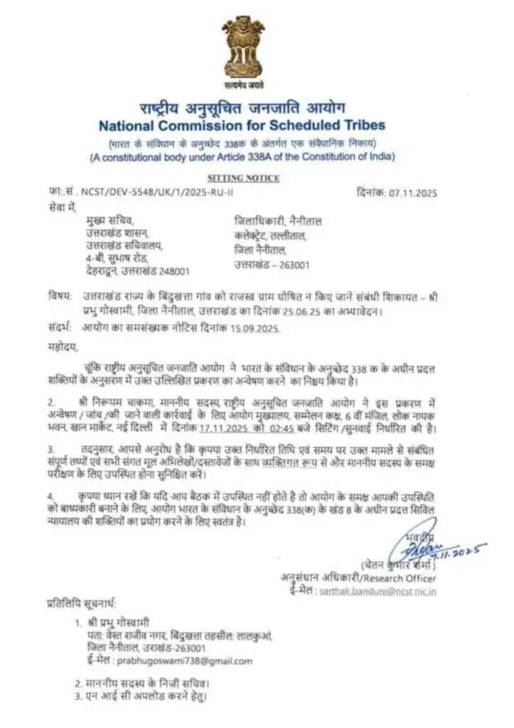 बिंदुखत्ता को राजस्व ग्राम घोषित न किए जाने के मामले में राष्ट्रीय अनुसूचित जनजाति आयोग की सुनवाई 17 नवम्बर को