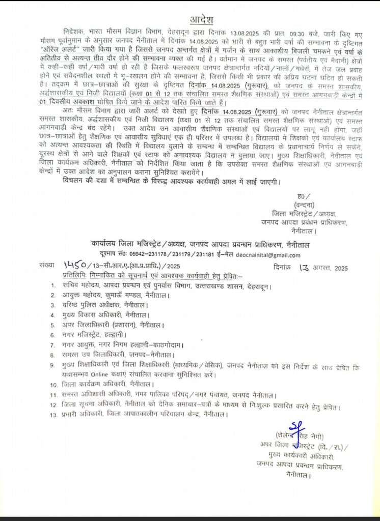 निदेशक, भारत मौसम विज्ञान विभाग, देहरादून द्वारा दिनांक 13.08.2025 की प्रातः 09:30 बजे, जारी किए गए मौसम पूर्वानुमान के अनुसार जनपद नैनीताल में दिनांक 14.08.2025 को भारी से बहुत भारी वर्षा की सम्भावना के दृष्टिगत “ऑरेंज अलर्ट” जारी किया गया है जिससे जनपद अन्तर्गत क्षेत्रों में गर्जन के साथ आकाशीय बिजली चमकने एवं वर्षा के अतितीव्र से अत्यन्त तीव्र दौर होने की सम्भावना व्यक्त की गई है। वर्तमान में जनपद के समस्त (पर्वतीय एवं मैदानी) क्षेत्रों में कहीं-कहीं वर्षा/भारी वर्षा हो रही है जिसके फलस्वरूप जनपद क्षेत्रान्तर्गत नदियों/नालों / गधेरों, में तेज जल प्रवाह होने एवं संवेदनशील स्थलों में भू-स्खलन होने की सम्भावना है. जिससे किसी भी प्रकार की अप्रिय घटना घटित हो सकती है। तद्क्रम में छात्र-छात्राओं की सुरक्षा के दृष्टिगत दिनांक 14.08.2025 (गुरुवार), को जनपद के समस्त शासकीय, अर्द्धशासकीय एवं निजी विद्यालयों (कक्षा 01 से 12 तक संचालित समस्त शैक्षणिक संस्थाओं) एवं समस्त आंगनबाड़ी केन्द्रों में 01 दिवसीय अवकाश घोषित किये जाने के आदेश पारित किये जाते हैं।