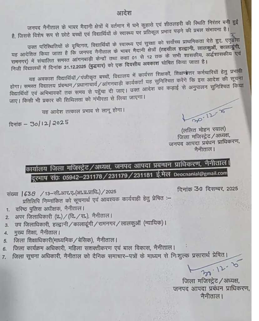 इ उक्त परिस्थितियों के दृष्टिगत, विद्यार्थियों के स्वास्थ्य एवं सुरक्षा को सर्वोच्च प्राथमिकता देते हुए, एतूद्वोरा यह आदेशित किया जाता है कि जनपद नैनीताल के भाबर मैदानी क्षेत्रों (तहसील हल्द्वानी, लालकुआँ, कालाढुंगी, रामनगर) में संचालित समस्त आंगनबाड़ी केन्द्रों तथा कक्षा 01 से 12 तक के सभी शासकीय, अर्द्धशासकीय एवं निजी विद्यालयों में दिनांक 31.12.2025 (बुद्धवार) को एक दिवसीय अवकाश घोषित किया जाता है।