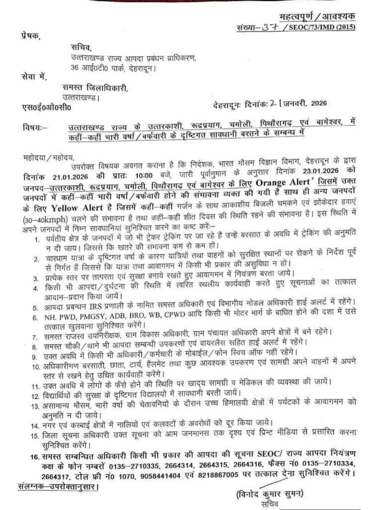 उपरोक्त विषयक अवगत कराना है कि निदेशक, भारत मौसम विज्ञान विभाग, देहरादून के द्वारा दिनांक 21.01.2026 की प्रातः 10:00 बजे, जारी पूर्वानुमान के अनुसार दिनांक 23.01.2026 को जनपद-उत्तरकाशी, रूद्रप्रयाग, चमोली, पिथौरागढ़ एवं बागेश्वर के लिए Orange Alert जिसमें उक्त जनपदों में कहीं-कहीं भारी वर्षा / बर्फवारी होने की संभावना व्यक्त की गयी है साथ ही अन्य जनपदों के लिए Yellow Alert है जिसमें कहीं-कहीं गर्जन के साथ आकाशीय बिजली चमकने एवं झोंकेदार हवाएं (30-40kmph) चलने की संभावना है तथा कहीं-कहीं शीत दिवस की स्थिति रहने की संभावना है। इस अपने जनपदों में निम्न सावधानियां सुनिश्चित करने का कष्ट करें:-स्थिति में