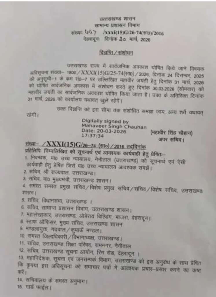 Uttarakhand city news dehradun शासन ने अहम निर्णय लेते हुए महावीर जयंती के सार्वजनिक अवकाश में संशोधन किया है। जारी अधिसूचना के अनुसार अब राज्य में महावीर जयंती का अवकाश 31 मार्च 2026 के बजाय 30 मार्च 2026 (सोमवार) को रहेगा।