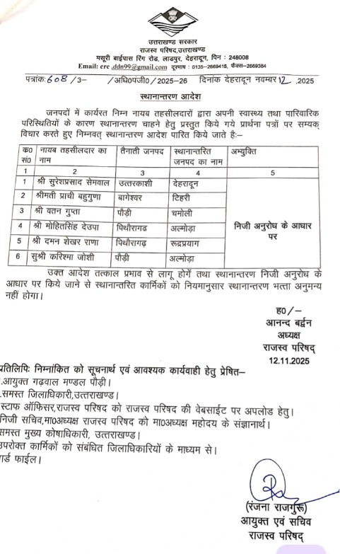 राजस्व परिषद, उत्तराखण्ड ने प्रदेश के विभिन्न जनपदों में कार्यरत छह नायब तहसीलदारों के स्थानांतरण आदेश जारी किए हैं। ये तबादले संबंधित अधिकारियों के निजी अनुरोधों पर स्वास्थ्य एवं पारिवारिक कारणों के आधार पर किए गए हैं।