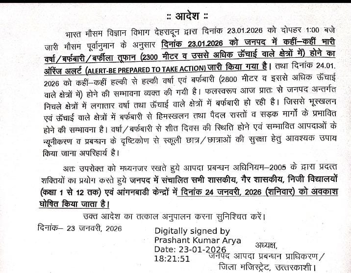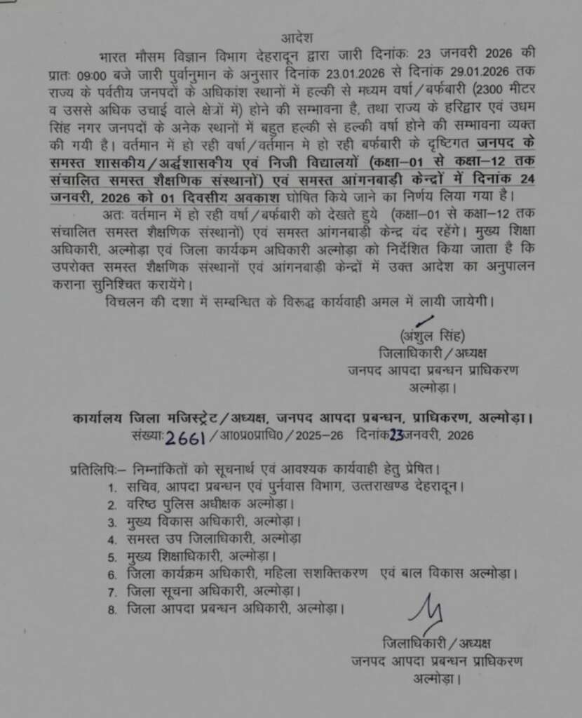 एवं कुछ स्थानों में भारी वर्षा होने की सम्भावना व्यक्त की गई है।भारत मौसम विज्ञान विभाग, मौसम विज्ञान केन्द्र, देहरादून द्वारा जारी पुर्वानुमान अनुसार जनपद सहित राज्य के जनपदों में दिनांक 23-01-2026 से दिनांक 27.01.2026 तक कहीं-कहीं हल्की से मध्यम वर्षा एवं कुछ स्थानों में भारी वर्षा होने की सम्भावना व्यक्त की गई है।अतः विद्यार्थियों के हित एवं सुरक्षा को दृष्टिगत रखते हुए यह आदेश निर्गत किया जाता है कि दिनांक 24 जनवरी, 2026 (शनिवार) को जनपद ऊधमसिंह नगर देहरादून उत्तरकाशी, टिहरी, पिथौरागढ़ और पौड़ी समेत कई जनपदों क के समस्त शासकीय, अशासकीय, सहायता प्राप्त एवं निजी विद्यालयों में कक्षा 12 तक के समस्त विद्यार्थियों तथा सभी आंगनबाड़ी केन्द्रों के बच्चों हेतु अवकाश घोषित किया जाता है।उपरोक्त आदेश से किसी भी प्रकार का विचलन आपदा प्रबंधन अधिनियम, 2005 के सुसंगत प्रावधानों का उल्लंघन माना जाएगा।