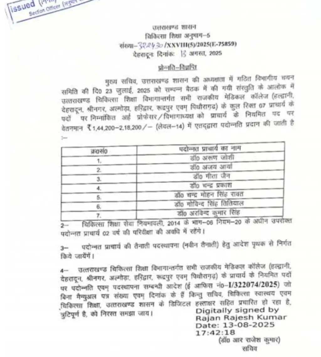 देहरादून: (बड़ी खबर) 7 वरिष्ठ चिकित्सकों को प्राचार्य पद पर पदोन्नति