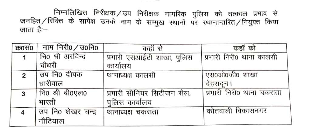 वरिष्ठ पुलिस अधीक्षक ने निरीक्षक और उप निरीक्षकों के स्थानांतरण के आदेश निरीक्षक और उप निरीक्षक के जारी किए है 04/02/2026 को वरिष्ठ पुलिस अधीक्षक देहरादून द्वारा निम्न निरीक्षकों/उप निरीक्षकों के स्थानांतरण उनके नाम के सम्मुख अंकित स्थानों पर किए गए।
