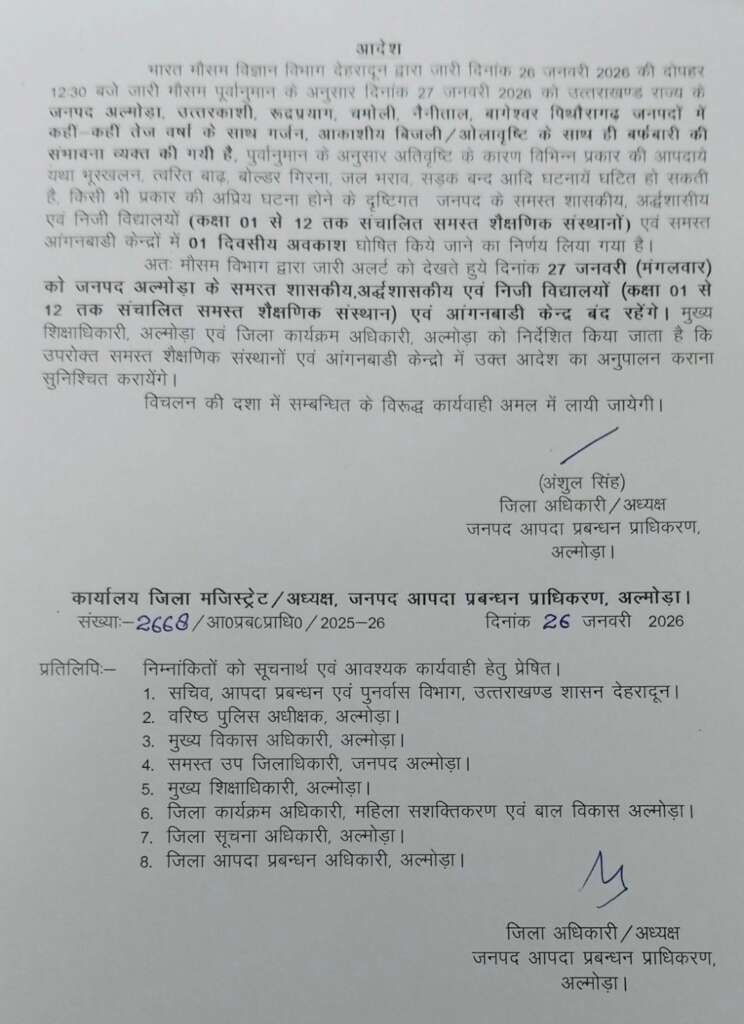 अतः मौसम विभाग द्वारा जारी अलर्ट को देखते हुये दिनांक 27 जनवरी (मंगलवार) को जनपद अल्मोड़ा के समस्त शासकीय, अर्द्धशासकीय एवं निजी विद्यालयों (कक्षा 01 से 12 तक संचालित समस्त शैक्षणिक संस्थान) एवं आंगनबाडी केन्द्र बंद रहेंगे। मुख्य शिक्षाधिकारी, अल्मोड़ा एवं जिला कार्यक्रम अधिकारी, अल्मोड़ा को निर्देशित किया जाता है कि उपरोक्त समस्त शैक्षणिक संस्थानों एवं आंगनबाडी केन्द्रो में उक्त आदेश का अनुपालन कराना सुनिश्चित करायेंगे।