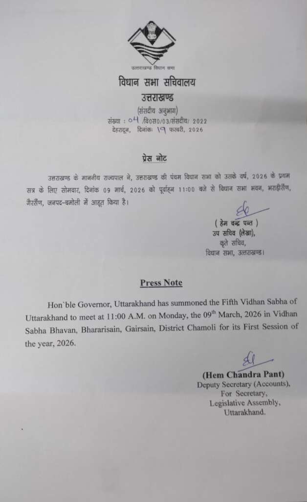 उत्तराखण्ड विधान सभा सचिवालय की ओर से जारी प्रेस नोट के अनुसार, माननीय राज्यपाल ने वर्ष 2026 के लिए पंचम उत्तराखण्ड विधान सभा के प्रथम सत्र को आहूत कर दिया है। यह सत्र सोमवार, 09 मार्च 2026 को पूर्वाह्न 11:00 बजे से आयोजित होगा।