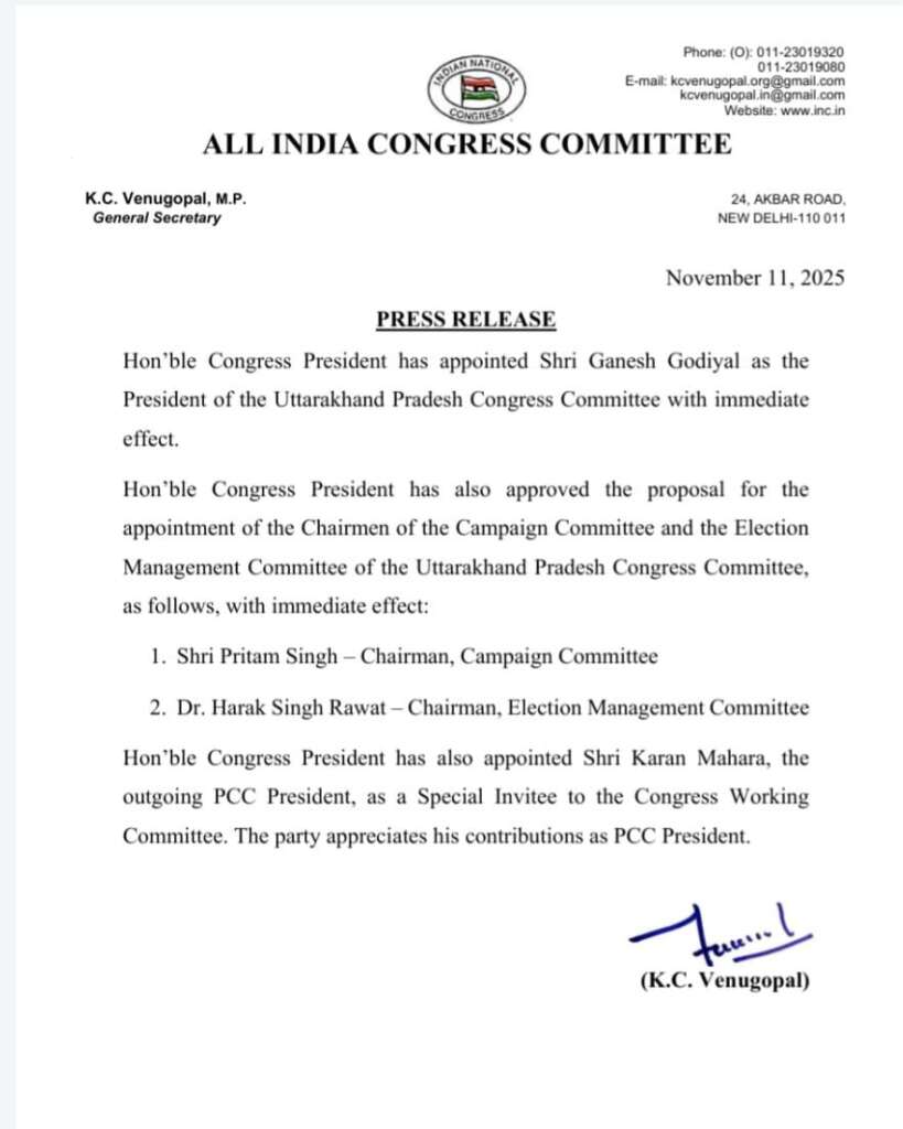 सूत्रों के अनुसार, नए अध्यक्ष गणेश गोदियाल को आगामी विधानसभा चुनावों से पहले संगठन को मजबूत करने और कांग्रेस कार्यकर्ताओं में नई ऊर्जा लाने की जिम्मेदारी सौंपी गई है।