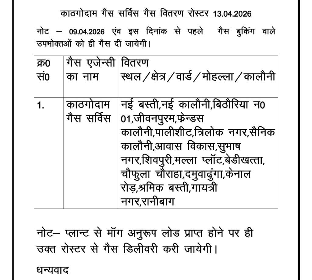 हल्द्वानी में उपभोक्ताओं की सुविधा के लिए गैस एजेंसी ने एलपीजी सिलेंडर वितरण का नया रोस्टर जारी कर दिया है। जारी कार्यक्रम के अनुसार शहर के विभिन्न क्षेत्रों में निर्धारित तिथियों और स्थानों पर गैस का वितरण किया जाएगा।