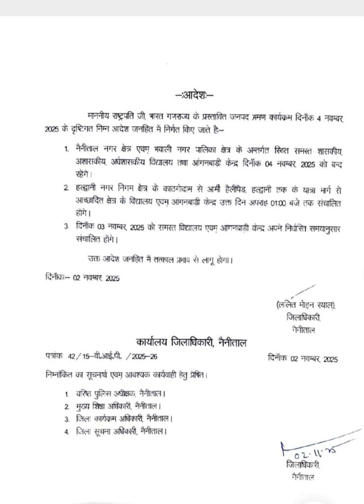 जिलाधिकारी ललित मोहन रयाल ने अवगत कराया कि भारत गणराज्य के माननीय राष्ट्रपति जी के जनपद नैनीताल भ्रमण कार्यक्रम दिनांक 4 नवंबर 2025 के दृष्टिगत नैनीताल नगर क्षेत्र एवं भवाली नगर पालिका क्षेत्र के अंतर्गत स्थित समस्त शासकीय विद्यालय तथा आंगनबाड़ी केंद्र दिनांक 4 नवंबर