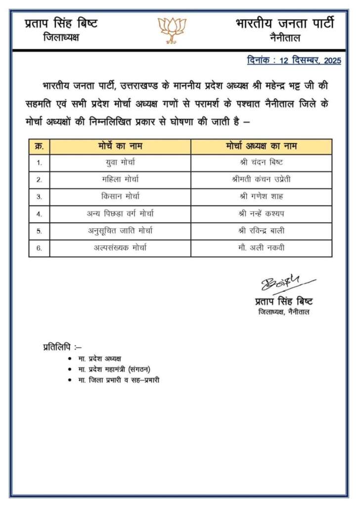 भारतीय जनता पार्टी, उत्तराखण्ड के प्रदेश अध्यक्ष श्री महेन्द्र भट्ट की सहमति एवं सभी प्रदेश मोर्चा अध्यक्ष गणों से परामर्श के पश्चात नैनीताल जिले के मोर्चा अध्यक्षों की निम्नलिखित प्रकार से घोषणा की जाती हैl