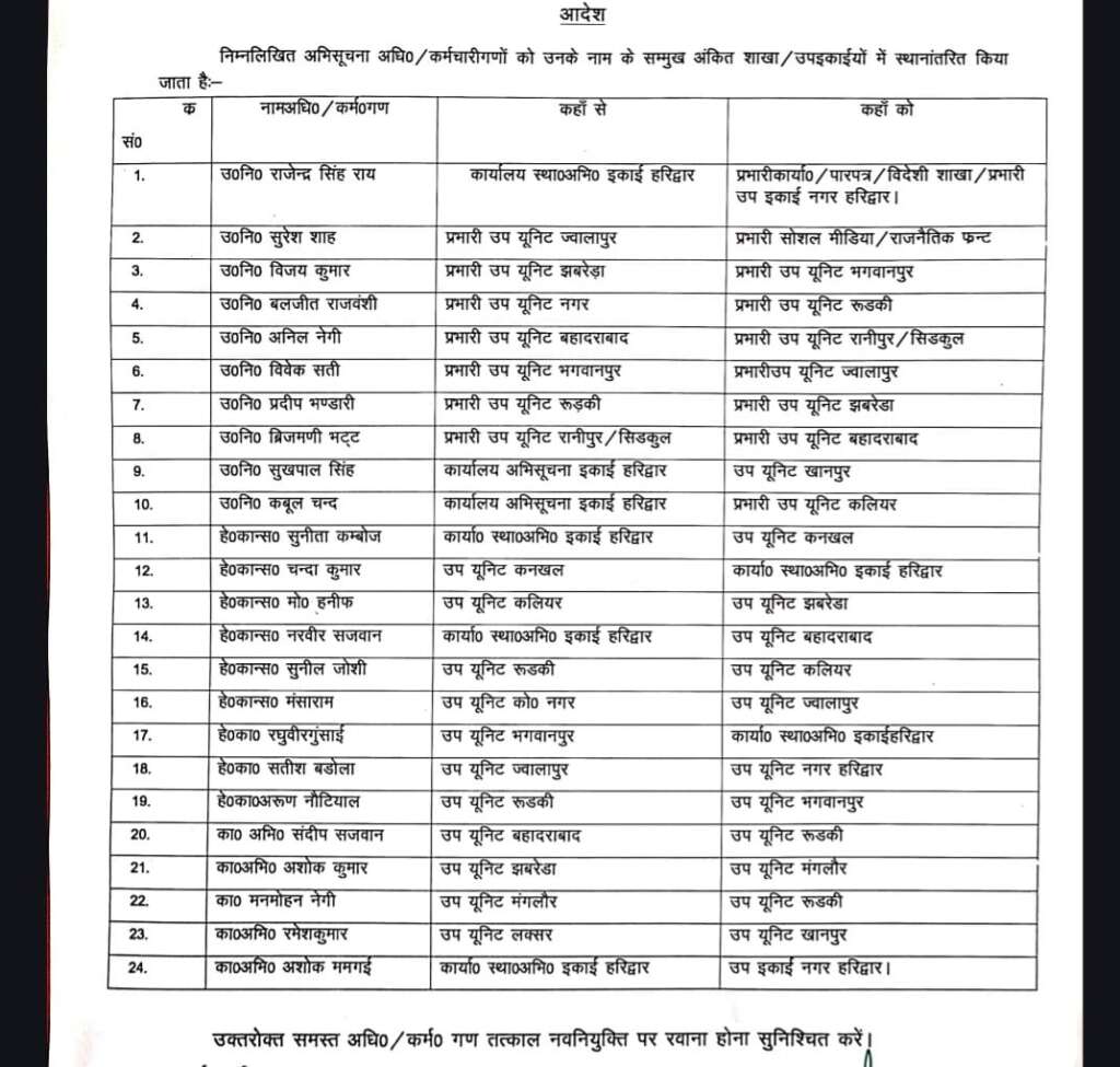 Uttarakhand city news पुलिस महकमे में बड़ा बदलाव हुआ है आगामी कुंभ मेला एवं चुनाव के दृष्टिगत एसएसपी हरिद्वार द्वारा खुफिया तंत्र विभाग को सुदृढ़ किए जाने हेतु उनके कार्य क्षेत्र में किया बड़ा बदलाव ।