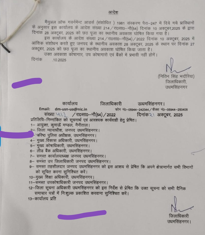 Uttarakhand city news छठ पर्व को लेकर जिला प्रशासन ने अहम निर्णय लेते हुए स्थानीय अवकाश घोषित करने के निर्देश जारी किए हैं जिला अधिकारी उधम सिंह नगर के द्वारा जारी आदेश के तहत मैनुअल ऑफ गवर्नमेन्ट आडर्स (संशोधित) 1981 संस्करण पैरा-247 में दिये गये प्राविधानों के अनुसार इस कार्यालय के आदेश संख्या 214/रा0सा0-नौ (54) दिनांक 10 अक्टूबर, 2025 के द्वारा दिनांक 28 अक्टूबर, 2025 को छठ पूजा का स्थानीय अवकाश घोषित किया गया है।