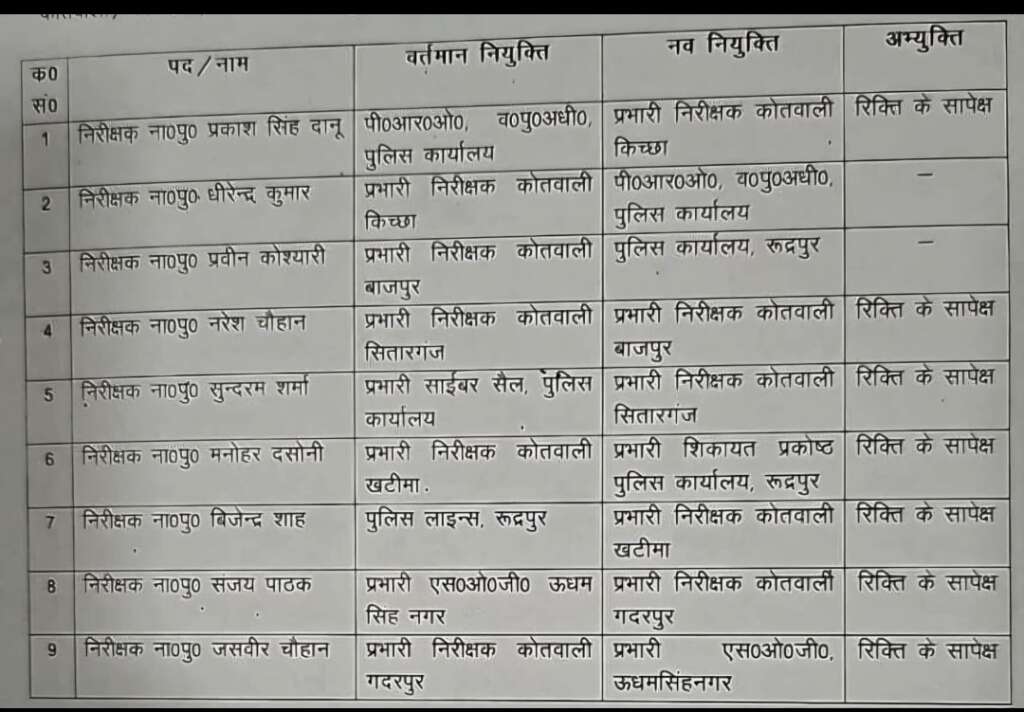 उधम सिंह नगर। वरिष्ठ पुलिस अधीक्षक मणिकांत मिश्रा ने जिले में कई थानों के प्रभारी निरीक्षकों का स्थानांतरण आदेश जारी किया है। आदेश के अनुसार —
