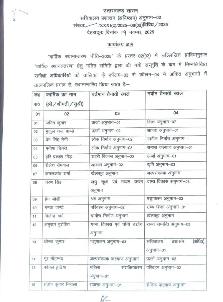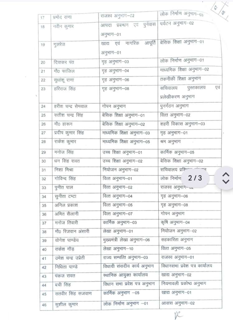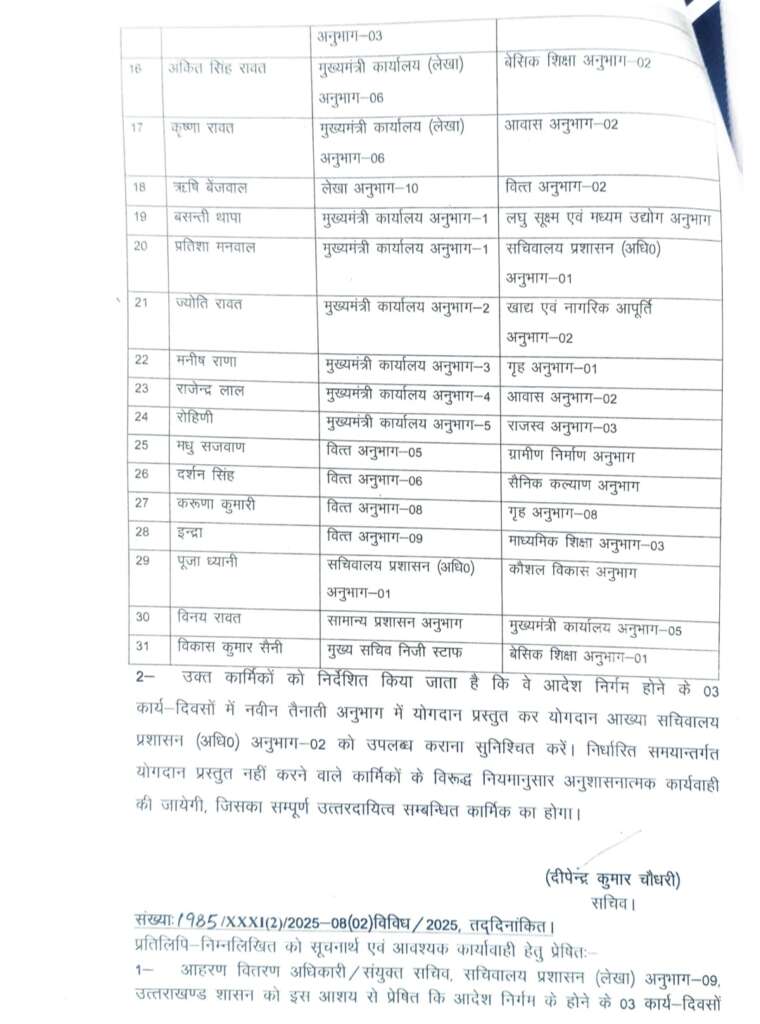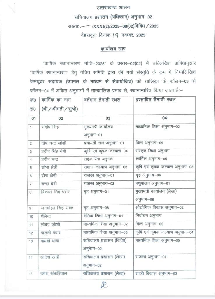 बड़ी संख्या में तबादले हुए हैं। सचिवालय सेवा के 49 समीक्षा अधिकारी, 15 सहायक समीक्षा अधिकारी, 31 कंप्यूटर