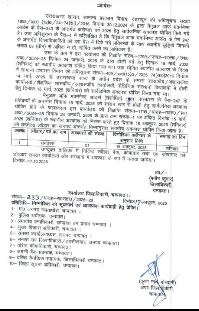 “धनतेरस पर्व का स्थानीय अवकाश जनपद के सभी कार्यालयों एवं संस्थानों में मनाया जाएगा।”