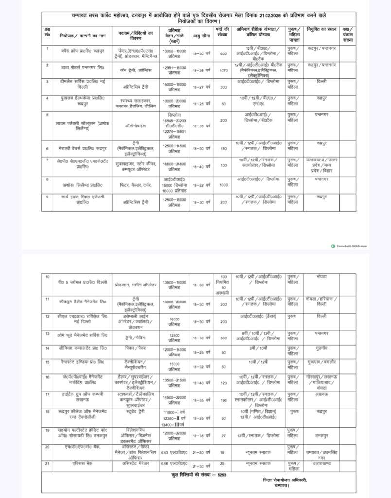 जिला सेवायोजन कार्यालय, चम्पावत के तत्वावधान में आयोजित इस मेले में निजी क्षेत्र की प्रतिष्ठित कंपनियां युवाओं को रोजगार के सुनहरे अवसर प्रदान करेंगी। जारी सूची के अनुसार इस रोजगार मेले में कुल 21 नियोजक कंपनियां प्रतिभाग कर रही हैं तथा विभिन्न क्षेत्रों में कुल 5253 रिक्त पदों पर भर्ती की प्रक्रिया संचालित की जाएगी।