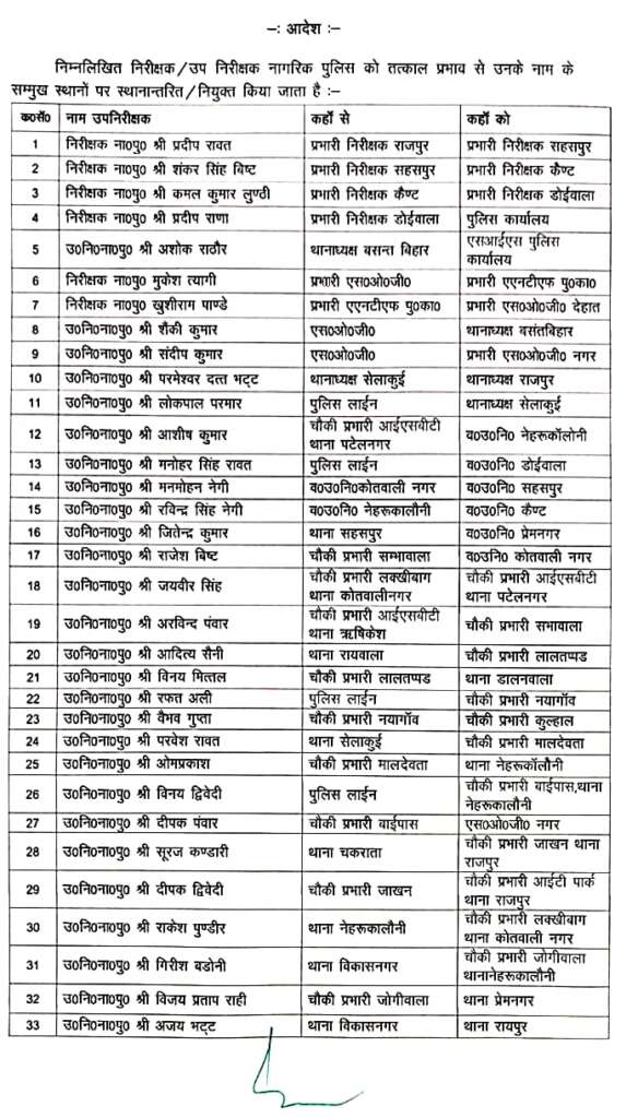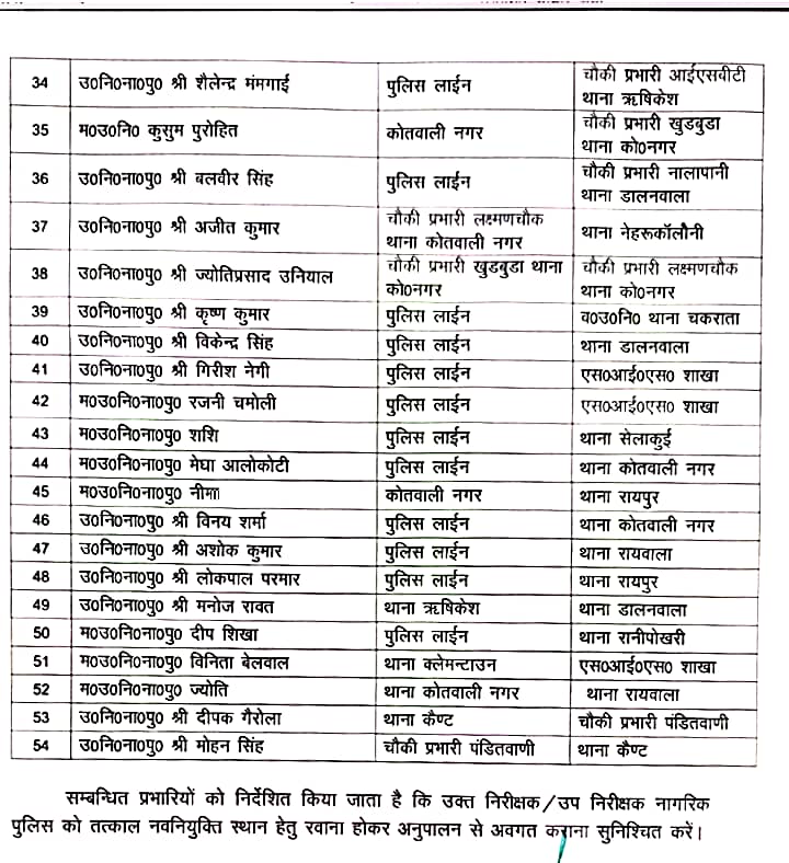 Uttarakhand city news dehradun वरिष्ठ पुलिस अधीक्षक ने कानून व्यवस्था और बेहतर करने के लिए बड़ी तादात में निरीक्षक और उप निरीक्षक के स्थानांतरण आदेश जारी किए हैं देखेंसूची ।। देहरादून