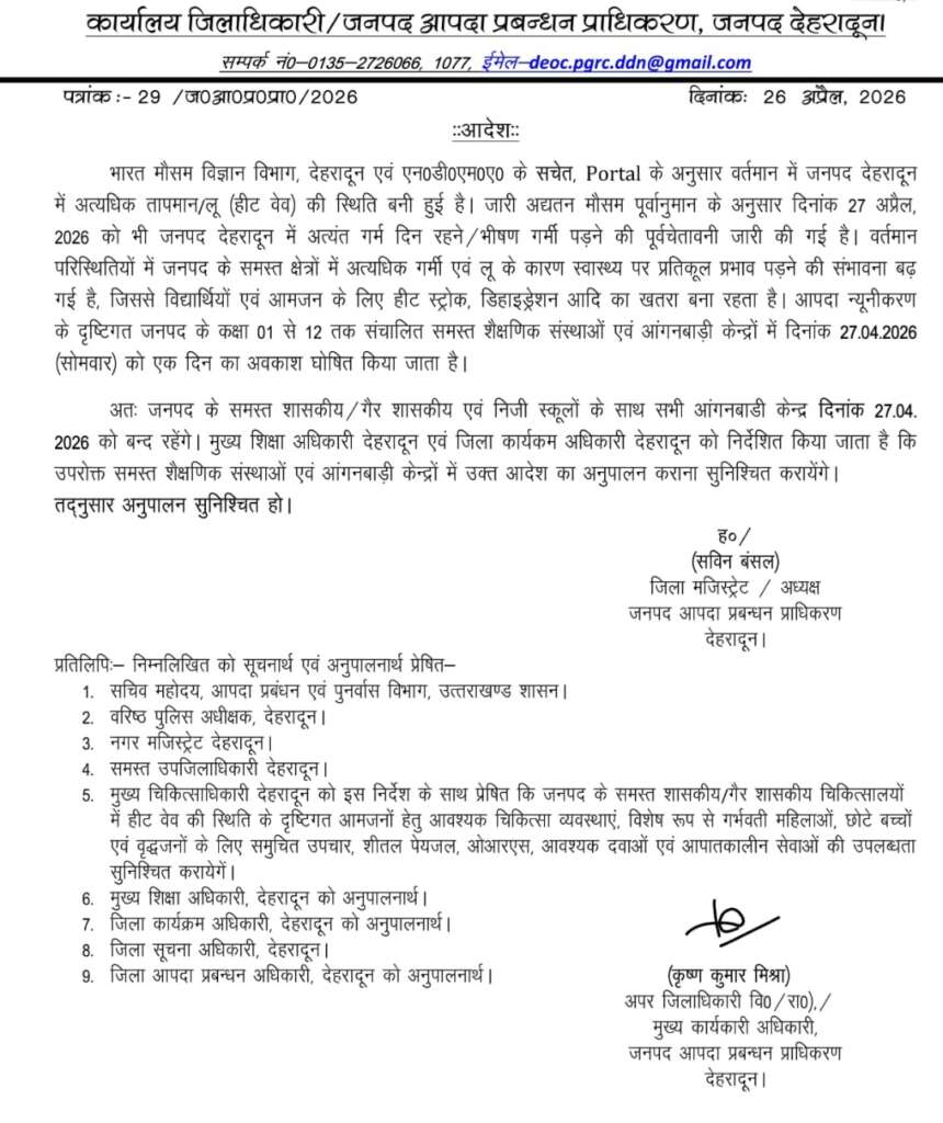 भारत मौसम विज्ञान विभाग, देहरादून एवं एन०डी०एम०ए० के सचेत, Portal के अनुसार वर्तमान में जनपद देहरादून में अत्यधिक तापमान/लू (हीट वेव) की स्थिति बनी हुई है। जारी अद्यतन मौसम पूर्वानुमान के अनुसार दिनांक 27 अप्रैल, 2026 को भी जनपद देहरादून में अत्यंत गर्म दिन रहने/भीषण गर्मी पड़ने की पूर्वचेतावनी जारी की गई है। वर्तमान परिस्थितियों में जनपद के समस्त क्षेत्रों में अत्यधिक गर्मी एवं लू के कारण स्वास्थ्य पर प्रतिकूल प्रभाव पड़ने की संभावना बढ़ गई है, जिससे विद्यार्थियों एवं आमजन के लिए हीट स्ट्रोक, डिहाइड्रेशन आदि का खतरा बना रहता है। आपदा न्यूनीकरण के दृष्टिगत जनपद के कक्षा 01 से 12 तक संचालित समस्त शैक्षणिक संस्थाओं एवं आंगनबाड़ी केन्द्रों में दिनांक 27.04.2026 (सोमवार) को एक दिन का अवकाश घोषित किया जाता है।