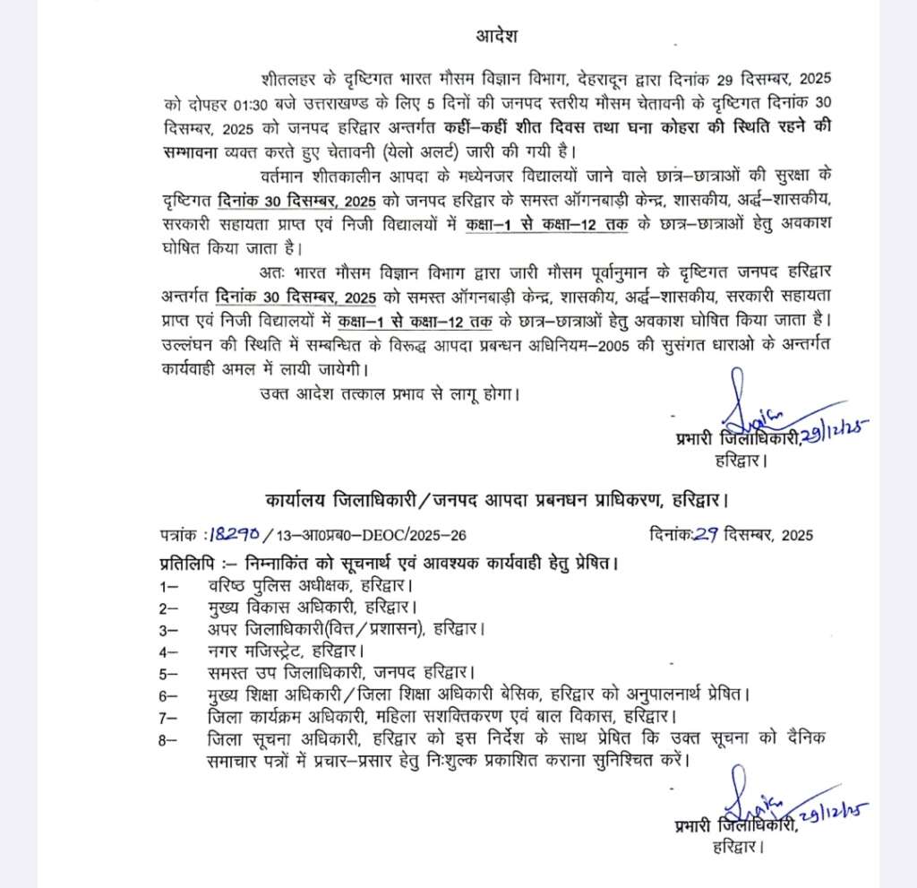 वर्तमान शीतकालीन आपदा के मध्येनजर विद्यालयों जाने वाले छात्र-छात्राओं की सुरक्षा के दृष्टिगत दिनांक 30 दिसम्बर, 2025 को जनपद हरिद्वार के समस्त ऑगनबाड़ी केन्द्र, शासकीय, अर्द्ध-शासकीय, सरकारी सहायता प्राप्त एवं निजी विद्यालयों में कक्षा 1 से कक्षा-12 तक के छात्र-छात्राओं हेतु अवकाश घोषित किया जाता है।