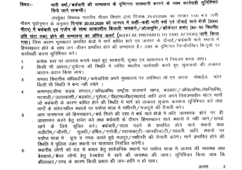 उपर्युक्त विषयक भारतीय मौसम विभाग द्वारा दिनाक 20.03.2026 को दोपहर 100 बजे जारी मौसम पूर्वानुमान के अनुसार दिनांक 20.03.2026 को जनपद में कहीं-कही भारी वर्षा एवं ऊँचाई वाले क्षेत्रों (3000 मीटर) में बर्फबारी एवं गर्जन के साथ आकाशीय बिजली चमकने / ओलावृष्टि / झोंकेदार हयांए (40-50 कि०मी० प्रति घंटा तक) होने की सम्भावना का ऑरेंज अलर्ट (ALERT-BE PREPARED TO TAKE ACTION) जारी किया गया। जिस कारण भूस्खलन प्रभावित क्षेत्रों में मार्ग बाधित हाने एवं जनपद के ऊँचाई / बर्फबारी वाले स्थानों में हिमस्खलन होने के साथ जन-जीवन प्रभावित होने की सम्भावना है। उक्त के दृष्टिगत निम्नलिखित बिन्दुओं पर कार्यवाही करना सुनिश्चित करें।