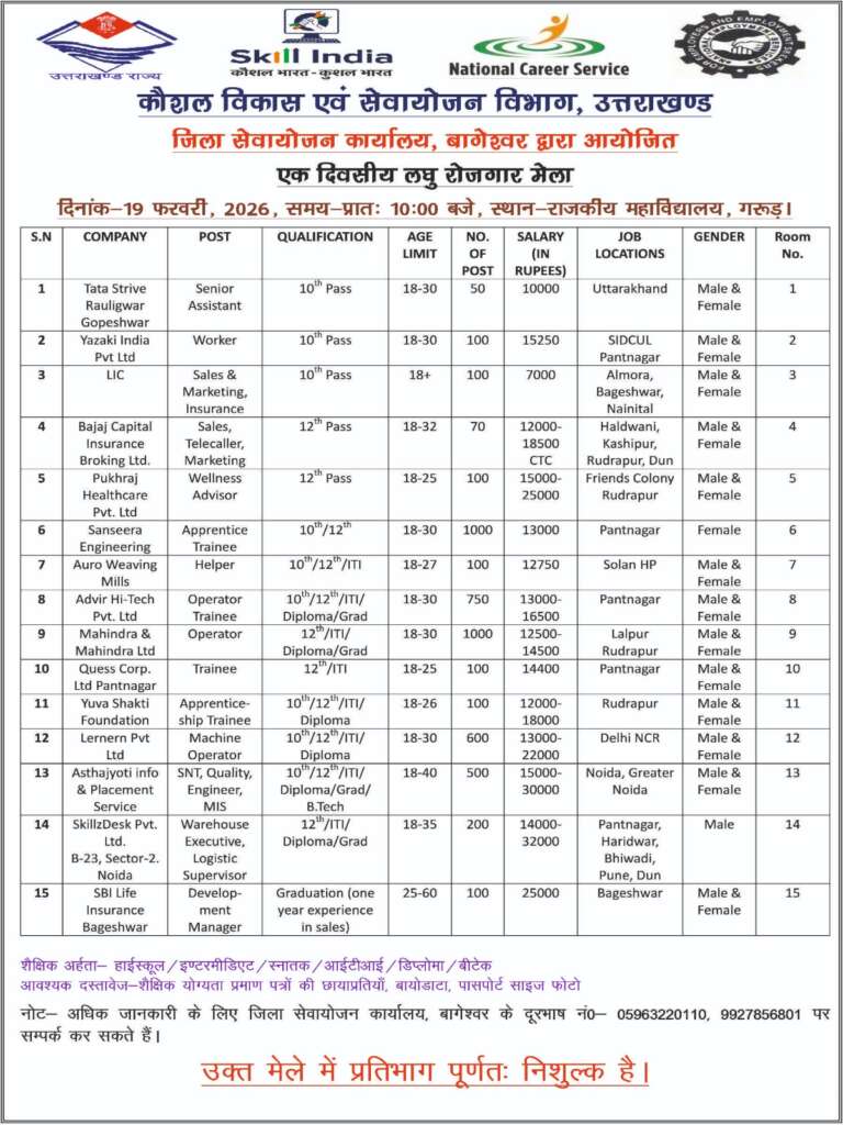 कौशल विकास एवं सेवायोजन विभाग, उत्तराखण्ड के तत्वावधान में जिला सेवायोजन कार्यालय, बागेश्वर द्वारा 19 फरवरी 2026 (गुरुवार) को प्रातः 10:00 बजे से राजकीय महाविद्यालय, गरुड़ में एक दिवसीय बृहद रोजगार मेले का आयोजन किया जा रहा है।