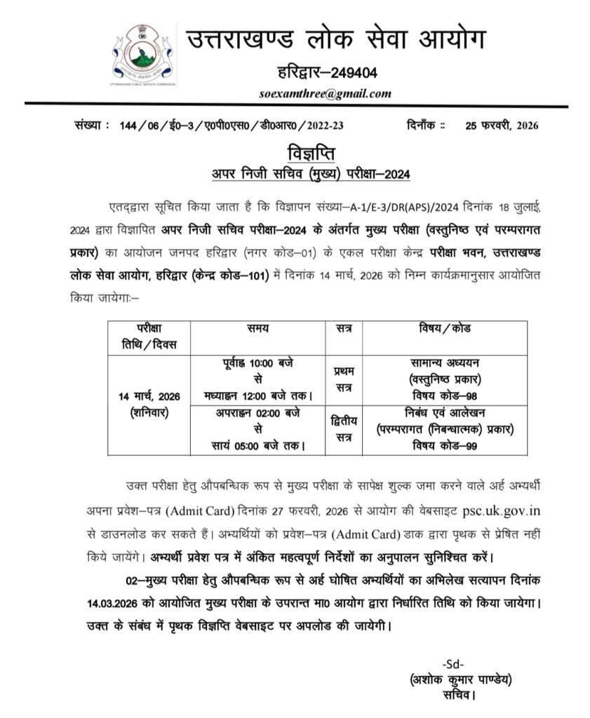 उत्तराखंड लोकसेवा आयोग ने अपर निजी सचिव अंतर्गत मुख्य परीक्षा को लेकर अपडेट जारी की है अब यह परीक्षा 14 मार्च को होगी इसकी अधिसूचना जारी की गई