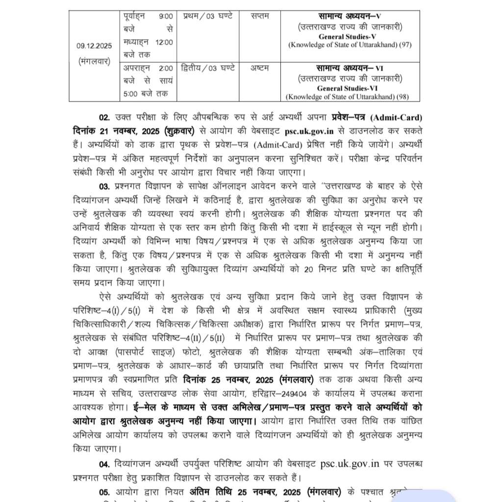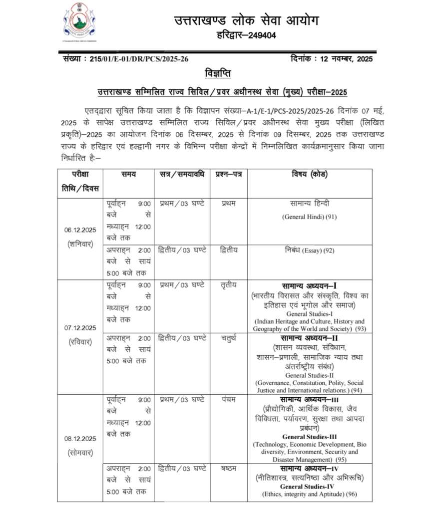 मुख्य परीक्षा (लिखित प्रकृति)-2025 का आयोजन दिनांक 06 दिसम्बर, 2025 से दिनांक 09 में दिसम्बर, 2025 तक उत्तराखण्ड राज्य के हरिद्वार एवं हल्द्वानी नगर के विभिन्न परीक्षा केन्द्रों में निम्नलिखित कार्यक्रमानुसार किए जाने का निर्णय लिया है जिसकी तारीख जारी कर दी गई है।