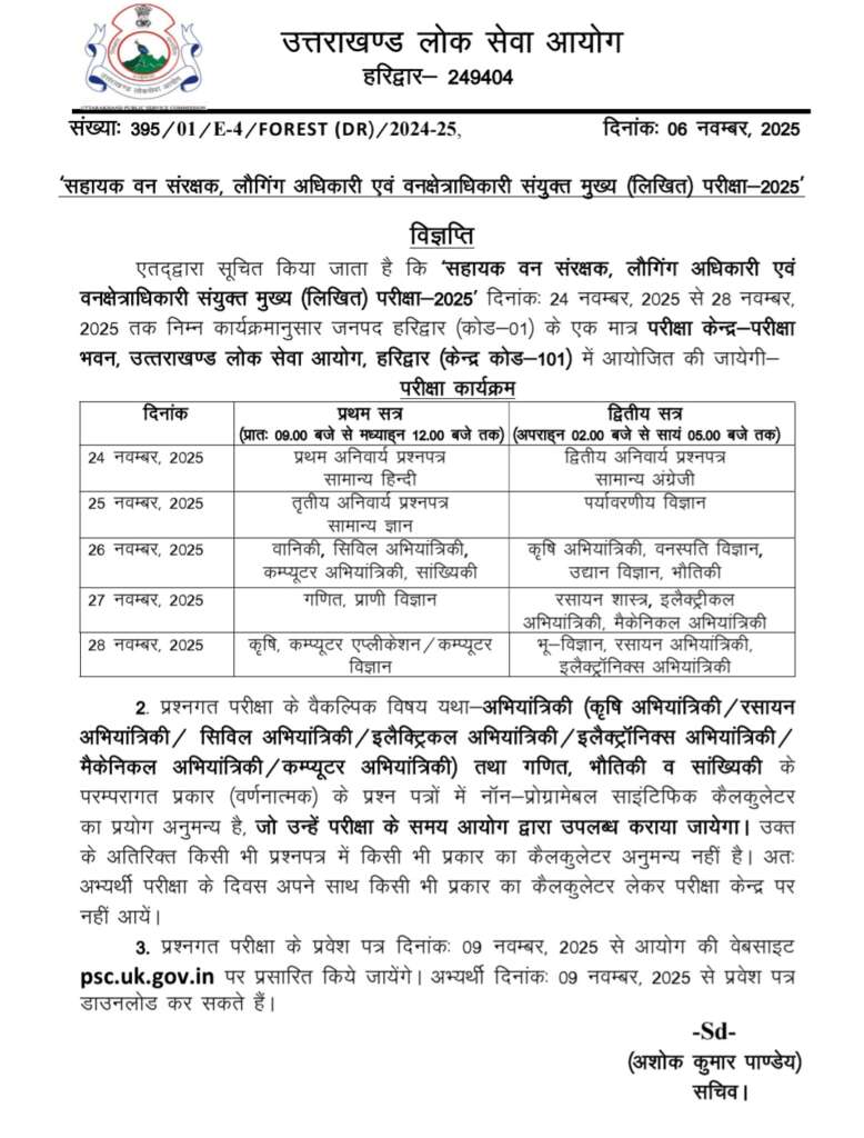उत्तराखण्ड लोक सेवा आयोग, हरिद्वार ने सहायक वन संरक्षक, लौगिंग अधिकारी एवं वनक्षेत्राधिकारी संयुक्त मुख्य (लिखित) परीक्षा-2025 की तिथियों की घोषणा कर दी है। आयोग द्वारा जारी विज्ञप्ति के अनुसार यह परीक्षा आगामी 24 नवम्बर से 28 नवम्बर, 2025 तक हरिद्वार जिले में स्थित आयोग के परीक्षा भवन में आयोजित की जाएगी।