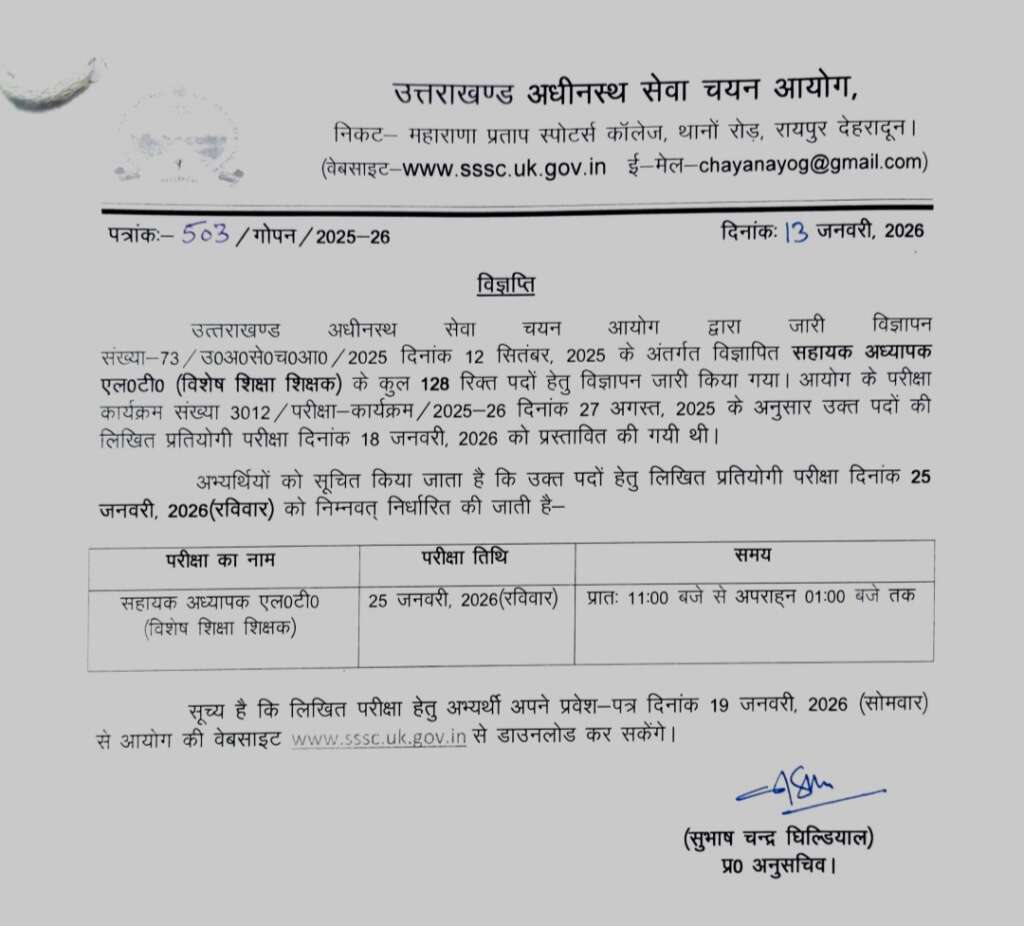 सेवा चयन आयोग द्वारा विज्ञापन अधीनस्थ उत्तराखण्ड जारी संख्या-73/उ०अ० से०च०आ०/2025 दिनांक 12 सितंबर, 2025 के अंतर्गत विज्ञापित सहायक अध्यापक एल०टी० (विशेष शिक्षा शिक्षक) के कुल 128 रिक्त पदों हेतु विज्ञापन जारी किया गया। आयोग के परीक्षा कार्यक्रम संख्या 3012/ परीक्षा-कार्यक्रम / 2025-26 दिनांक 27 अगस्त, 2025 के अनुसार उक्त पदों की लिखित प्रतियोगी परीक्षा दिनांक 18 जनवरी, 2026 को प्रस्तावित की गयी थी।