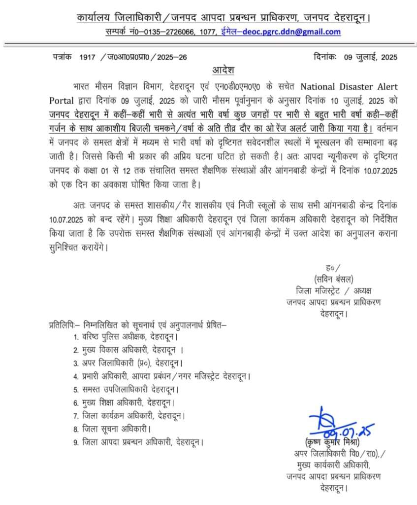 भारत मौसम विज्ञान विभाग, देहरादून एवं एन०डी०एम०ए० के सचेत National Disaster Alert Portal द्वारा दिनांक 09 जुलाई, 2025 को जारी मौसम पूर्वानुमान के अनुसार दिनांक 10 जुलाई, 2025 को जनपद देहरादून में कहीं-कहीं भारी से अत्यंत भारी वर्षा कुछ जगहों पर भारी से बहुत भारी वर्षा कहीं-कहीं गर्जन के साथ आकाशीय बिजली चमकने / वर्षा के अति तीव्र दौर का ओ रेंज अलर्ट जारी किया गया है। वर्तमान में जनपद के समस्त क्षेत्रों में मध्यम से भारी वर्षा को दृष्टिगत सवेदनशील स्थलों में भूस्खलन की सम्भावना बढ़ जाती है। जिससे किसी भी प्रकार की अप्रिय घटना घटित हो सकती है। अतः आपदा न्यूनीकरण के दृष्टिगत जनपद के कक्षा 01 से 12 तक संचालित समस्त शैक्षणिक संस्थाओं और आंगनबाडी केन्द्रों में दिनांक 10.07.2025 को एक दिन का अवकाश घोषित किया जाता है।