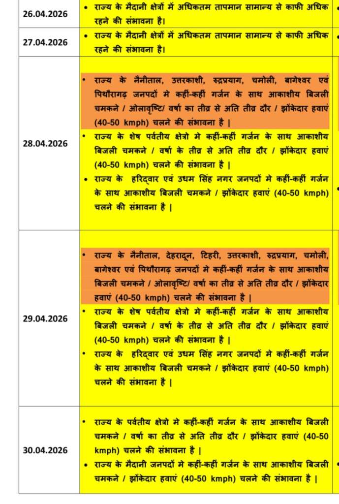 राज्य के नैनीताल, उत्तरकाशी, रुद्रप्रयाग, चमोली, बागेश्वर एवं पिथौरागढ़ जनपदों में कहीं-कहीं गर्जन के साथ आकाशीय बिजली चमकने / ओलावृष्टि / वर्षा का तीव्र से अति तीव्र दौर । झोंकेदार हवाएं (40-50 kmph) चलने की संभावना है। वही राज्य के शेष पर्वतीय क्षेत्रो मे कहीं-कहीं गर्जन के साथ आकाशीय बिजली चमकने । वर्षा के तीव्र से अति तीव्र दौर। झोंकेदार हवाएं (40-50 kmph) चलने की संभावना आईएमडी ने जताई है।
