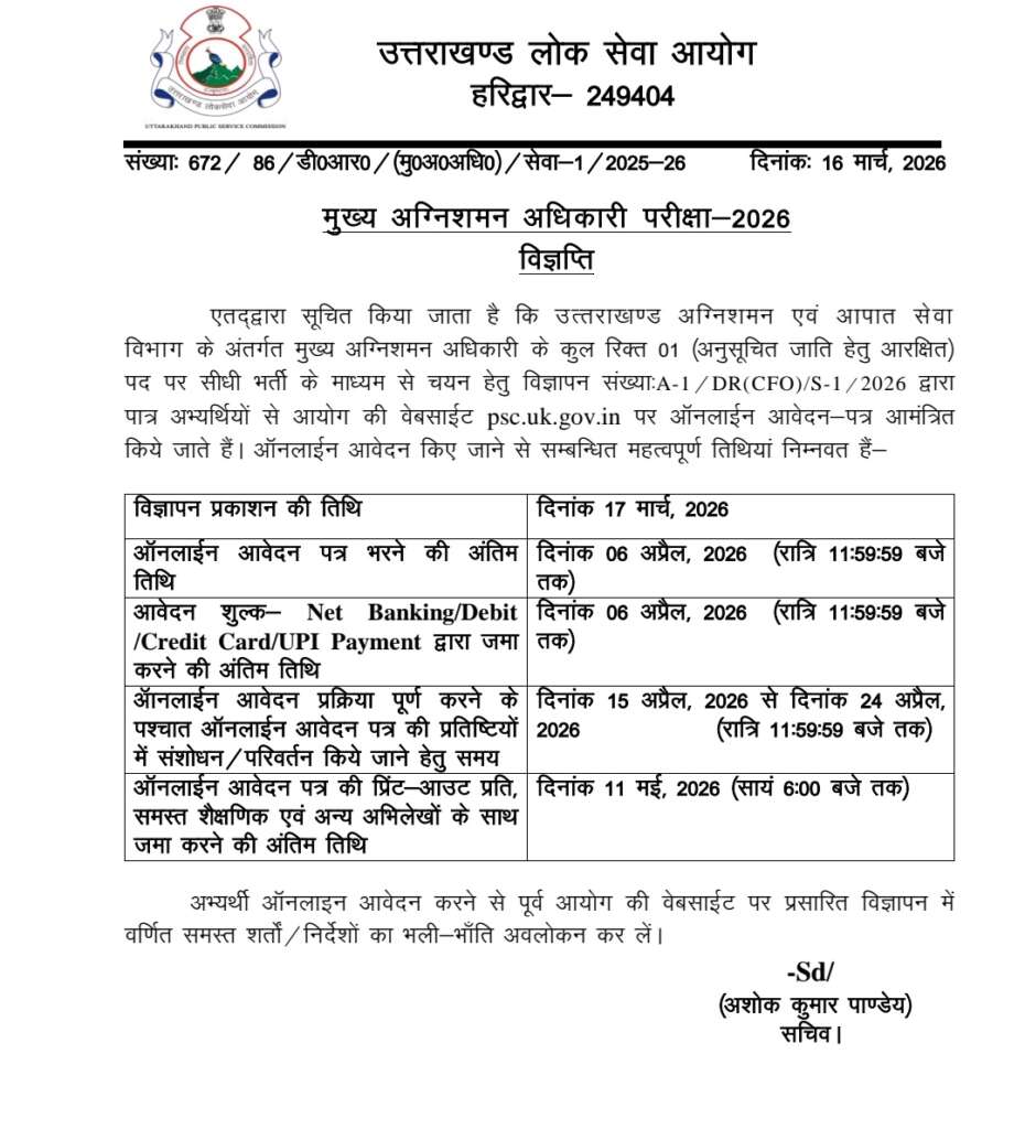 देहरादून। उत्तराखण्ड अग्निशमन एवं आपात सेवा विभाग के अंतर्गत मुख्य अग्निशमन अधिकारी (CFO) के एक रिक्त पद पर सीधी भर्ती के लिए विज्ञापन जारी किया गया है। यह पद अनुसूचित जाति वर्ग के लिए आरक्षित है। भर्ती प्रक्रिया के लिए विज्ञापन संख्या A-1/DR(CFO)/S-1/2026 जारी करते हुए पात्र अभ्यर्थियों से आयोग की आधिकारिक वेबसाइट psc.uk.gov.in के माध्यम से ऑनलाइन आवेदन आमंत्रित किए गए हैं।