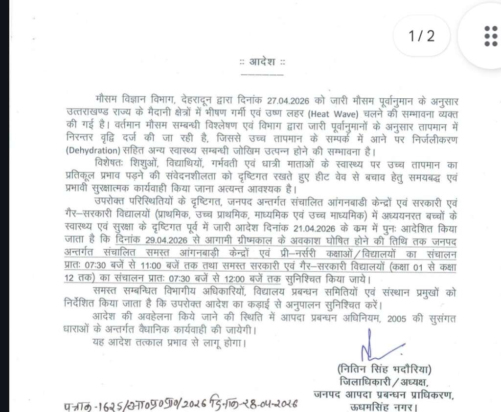 अपर जिलाधिकारी श्री योगेन्द्र सिंह ने अवगत कराया है कि राज्य आपातकालीन परिचालन केन्द्र, देहरादून से प्राप्त सूचना तथा भारत मौसम विज्ञान विभाग के पूर्वानुमान के अनुसार दिनांक 28 अप्रैल 2026 को जनपद पिथौरागढ़ सहित राज्य के अन्य जनपदों में कहीं-कहीं गर्जन के साथ आकाशीय बिजली चमकने, ओलावृष्टि तथा 40-50 कि.मी./घंटा की गति से झोंकेदार हवाएं चलने की संभावना व्यक्त की गई है। इस संबंध में मौसम विभाग द्वारा ऑरेंज अलर्ट जारी किया गया है।