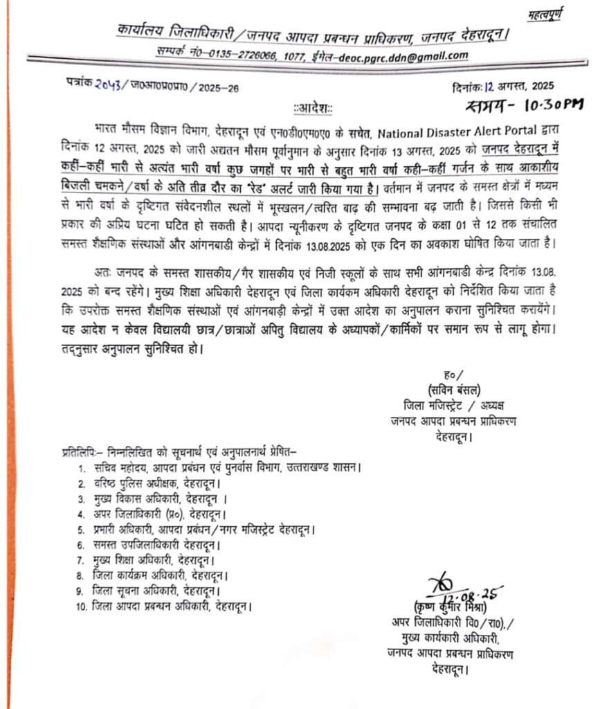 भारत मौसम विज्ञान विभाग, देहरादून एवं एन०डी०एम०ए० के सचेत, National Disaster Alert Portal द्वारा दिनांक 12 अगस्त, 2025 को जारी अद्यतन मौसम पूर्वानुमान के अनुसार दिनांक 13 अगस्त, 2025 को जनपद देहरादून में कहीं-कहीं भारी से अत्यंत भारी वर्षा कुछ जगहों पर भारी से बहुत भारी वर्षा कहीं-कहीं गर्जन के साथ आकाशीय बिजली चमकने/वर्षा के अति तीव्र दौर का ‘रेड’ अलर्ट जारी किया गया है। वर्तमान में जनपद के समस्त क्षेत्रों में मध्यम से भारी वर्षा के दृष्टिगत संवेदनशील स्थलों में भूस्खलन / त्वरित बाढ़ की सम्भावना बढ़ जाती है। जिससे किसी भी प्रकार की अप्रिय घटना घटित हो सकती है। आपदा न्यूनीकरण के दृष्टिगत जनपद के कक्षा 01 से 12 तक संचालित समस्त शैक्षणिक संस्थाओं और आंगनबाडी केन्द्रों में दिनांक 13.08.2025 को एक दिन का अवकाश घोषित किया जाता है।