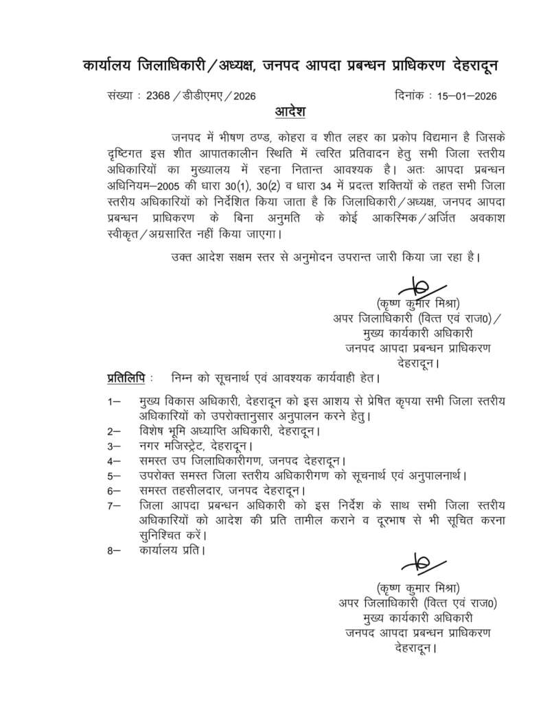 कार्यालय जिलाधिकारी / अध्यक्ष, जनपद आपदा प्रबन्धन प्राधिकरण देहरादून संख्या: 2368 / डीडीएमए / 2026 दिनांक: 15-01-2026 आदेश जनपद में भीषण ठण्ड,...