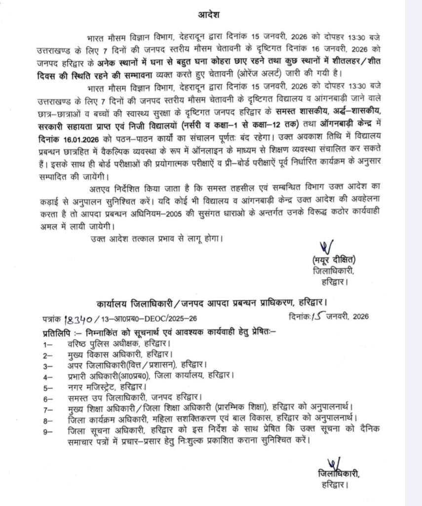 आदेश भारत मौसम विज्ञान विभाग, देहरादून द्वारा दिनांक 15 जनवरी, 2026 को दोपहर 13:30 बजे उत्तराखण्ड के लिए 7 दिनों की जनपद...