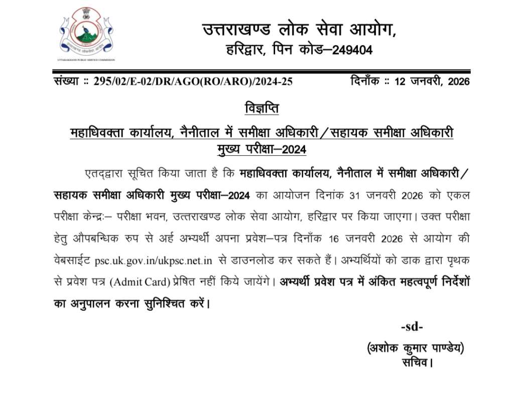 उत्तराखण्ड लोक सेवा आयोग, हरिद्वार, पिन कोड-249404 संख्या :: 295/02/E-02/DR/AGO(RO/ARO)/2024-25 दिनाँक :: 12 जनवरी, 2026 विज्ञप्ति महाधिवक्ता कार्यालय, नैनीताल में समीक्षा अधिकारी...