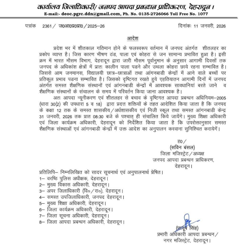 शीतलहर का असर: देहरादून में 31 जनवरी तक स्कूल व आंगनबाड़ी 8:30 बजे के बाद ही खुलेंगेदेहरादून।प्रदेश में जारी शीतकाल और बढ़ती...