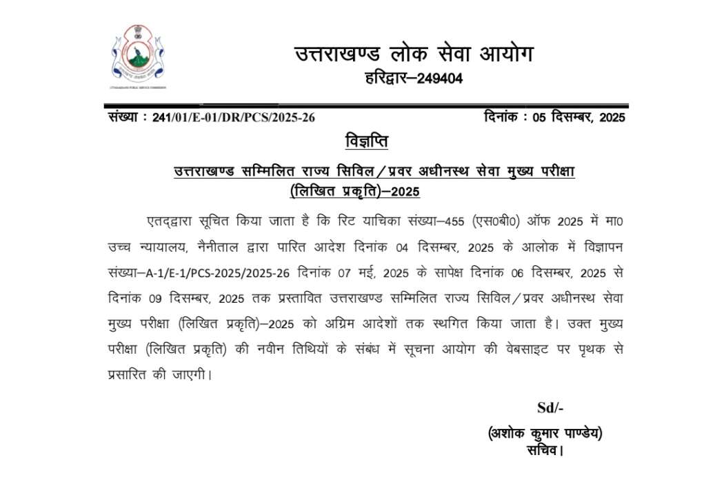 उत्तराखण्ड सम्मिलित राज्य सिविल / प्रवर अधीनस्थ सेवा मुख्य परीक्षा (लिखित प्रकृति)-2025 एतद्वारा सूचित किया जाता है कि रिट याचिका संख्या-455 (एस०बी०)...