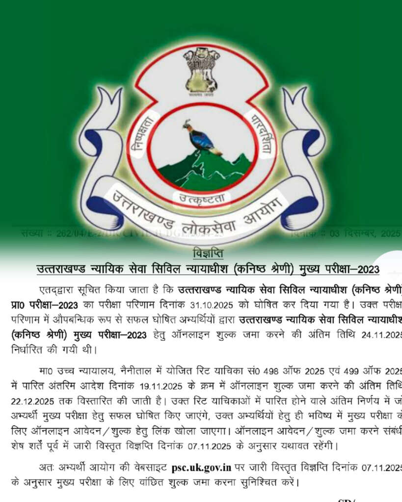 उत्तराखण्ड न्यायिक सेवा सिविल न्यायाधीश (कनिष्ठ श्रेणी) मुख्य परीक्षा-2023 उत्तराखण्ड न्यायिक सेवा सिविल न्यायाधीश (कनिष्ठ श्रेणी) प्रा० परीक्षा-2023 का परीक्षा परिणाम दिनांक...