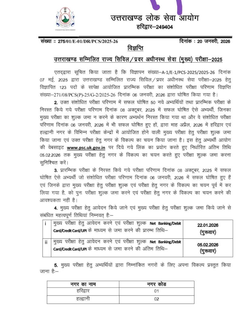 उत्तराखण्ड सम्मिलित राज्य सिविल / प्रवर अधीनस्थ सेवा (मुख्य) परीक्षा-2025 एतद्वारा सूचित किया जाता है कि विज्ञापन संख्या-A-1/E-1/PCS-2025/2025-26 दिनांक 07 मई, 2025...