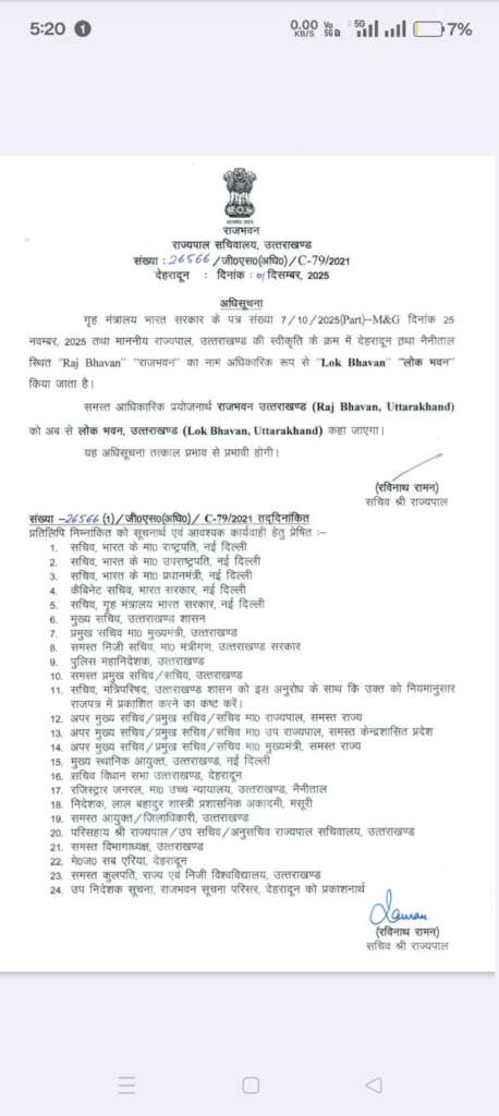 Uttarakhand city news dehradun उत्तराखंड में अब ‘राजभवन’ कहलाएगा ‘लोक भवन’ देहरादून। उत्तराखंड में देहरादून और नैनीताल स्थित राजभवन का नाम अब...